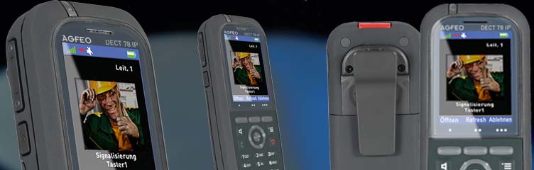 Das DECT 78 IP - ölresistent nach EN ISO 2812-4: 2017, macht mit seiner abwischbaren Folientastatur nicht nur in der Produktion und Werkstatt eine gute Figur, sondern auch überall da, wo man mit Feuchtigkeit und oder öligen Mitteln arbeiten muss. CTI-Telefonie, eine Notruftaste, Bluetooth 4.1 und Schutzklasse IP 65 runden den starken Gesamteindruck ab. Das nur 12,2 cm große und 134 g leichte Handteil lässt sich so bequem in jeder Tasche verstauen und das 2Zoll große TFT Farbdisplay zeigt Ihnen in Verbindung mit der IP-Video TFE, wer vor der Tür steht. Es ist für Umgebungen von -10 bis +55 Grad hervorragend geeignet. Anschlussart: über DECT IP-Basis, 2Zoll TFT Farbdisplay, beleuchtet, Standbyzeit max. 200 Stunden, Gesprächszeit max. 17 Stunden, Mobilteil T:22 mm,B:48 mm,H:122 mm, Ladeschale T:81 mm, B:59 mm, H:66 mm, Handteil-Schutzart: IP 65, stoßfest bis zu 2m Fallhöhe, Bluetooth für AGFEO Headsets, Headsetanschluss (3,5mm Klinke), Vibrationsalarm, Notruftaste, Farbausführung: grau, 20 Klingeltöne, antibakteriell nach ISO-Norm 22196 (2nd Edition), Ölresistent nach ISO-Norm 2812-4 (2017), 249 private Telefonbucheinträge, zentrales Telefonbuch (Zugriff auf bis zu 3000 Einträge der DECT IP-Basis oder auf Kontakte des CTI-Servers), Mikrofon-Stummschaltung, Anrufmanagement- Bedienung per DTMF, Freisprechen und Lauthören, Anklopfen Ein/Aus, Rauschunterdrückung (Noise Reduction), Rückfragefunktion, Türgongsimulation, Türöffnerfunktion, Anrufliste für ein-/abgehende und verpasste Anrufe, CLIP-Funktion Sehen wer anruft, automatische Rufannahme, Uhrzeit-/Datumsanzeige, Menüangepasste Navigationstasten, Anrufschutz, Tastensperre, Konferenzschaltung, Energiesparmodus, zwischen mehreren Verbindungen wechseln (makeln), Weckfunktion, Konferenzschaltung, Ruf Abweisen, Gesprächsübergabefunktion, Telefonschloss, Anrufschutz