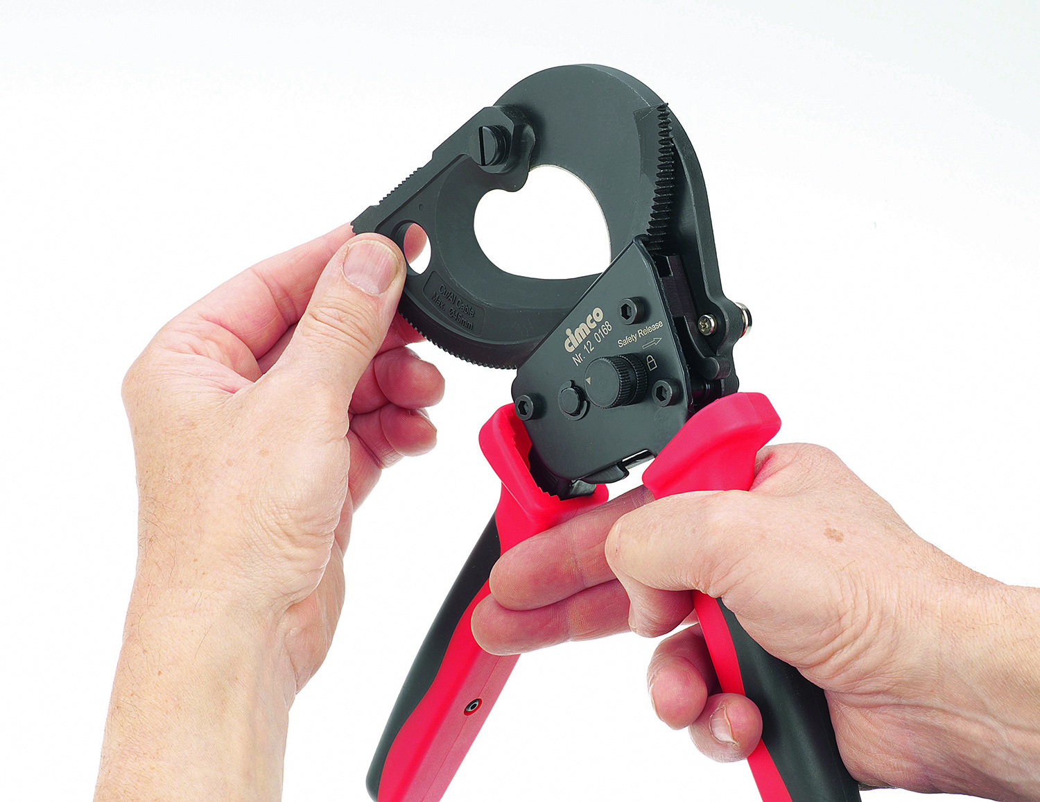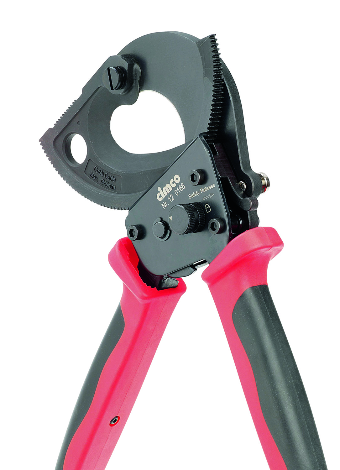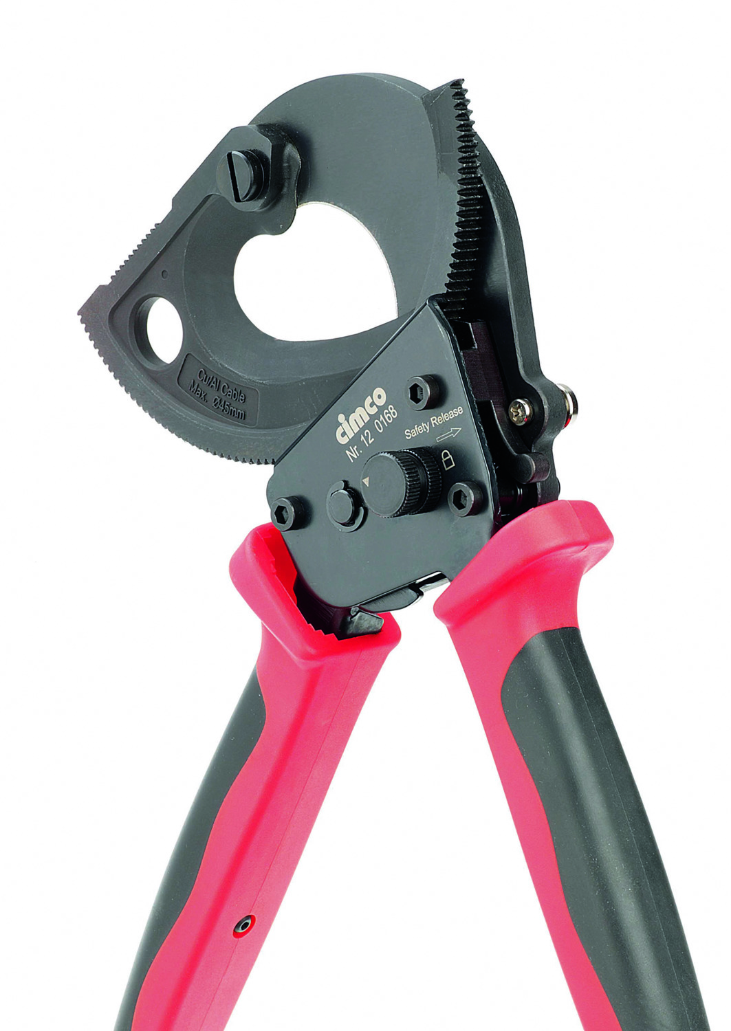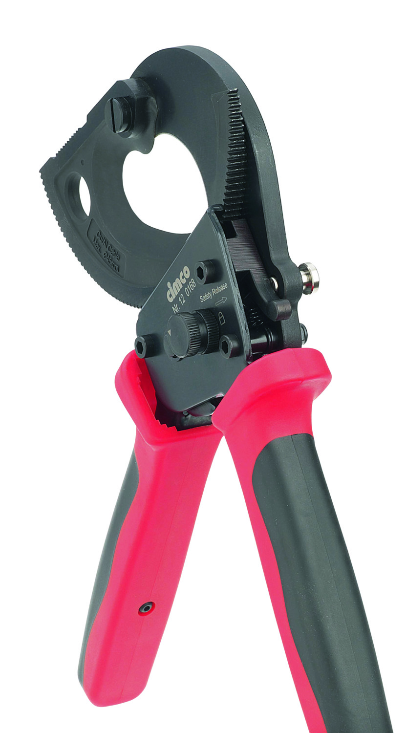 Einhand-Ratschen-Kabelschneider zum quetschfreien Schneiden von Kabeln mit einem Außendurchmesser von max. 45 mm. Geeignet für Kupfer- und Aluminiumkabel, nicht geeignet für Stahldraht, stahlarmierte Kabel und hartgezogene Cu- und Bz-Leiter. Sauberer Schnitt durch scharfe spezialgehärtete Schneiden, trotz kompakter Bauform dank Ratschenmechanik mit nadelgelagerter Exzenterübersetzung und ergonomischen Handgriffen mit geringerÖffnungsweite nur mit einer Hand kraftschonend bedienbar. Die Handgriffe sind jedoch lang genug, um bei Lastspitzen die zweite Hand unterstützend einzusetzen. Gewicht nur 980 g. Bewegliche, voll durchschwenkbare und in jeder Stellung entriegelbare Schneide, leicht austauschbar (Ersatzschwenkmesser Cimco-Artikelnr. 12 9168), Arretierung der Griffe über Drehknopf (rote Markierung), leichteÖffnung der Schneidmesser durch in Offenstellung arretierbarer Sperrklinke. Max. Schneidleistungen Cu ( Kupfer ) max. Ø 45 mm, mehrdrähtig 300 mm² / 600 mCM, Sektorleiter 3x70SM; AL (Aluminium max. Ø 45 mm, mehrdrähtig 400 mm² / 800 MCM; Sektorleiter 4x70 SE