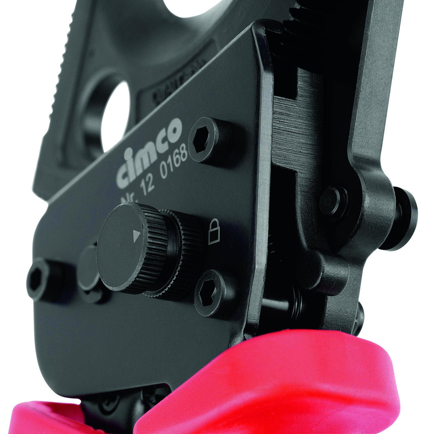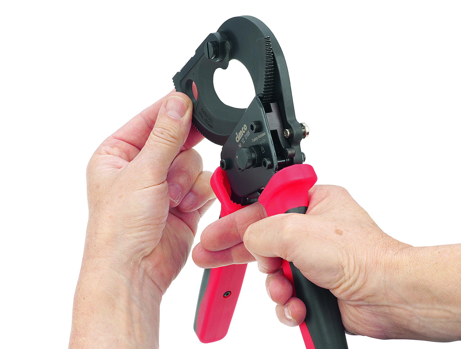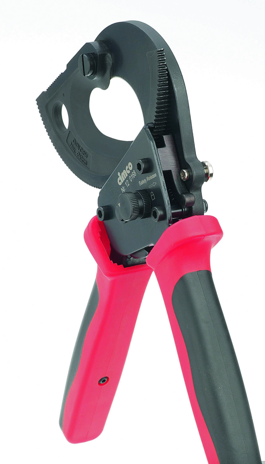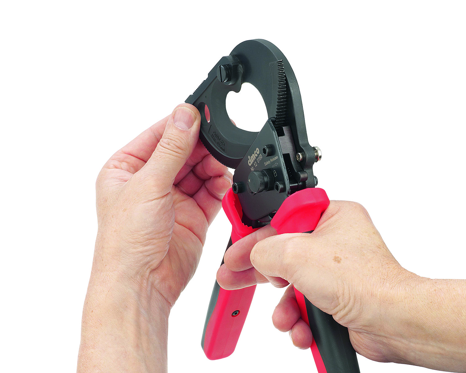 Einhand-Ratschen-Kabelschneider zum quetschfreien Schneiden von Kabeln mit einem Außendurchmesser von max. 45 mm. Geeignet für Kupfer- und Aluminiumkabel, nicht geeignet für Stahldraht, stahlarmierte Kabel und hartgezogene Cu- und Bz-Leiter. Sauberer Schnitt durch scharfe spezialgehärtete Schneiden, trotz kompakter Bauform dank Ratschenmechanik mit nadelgelagerter Exzenterübersetzung und ergonomischen Handgriffen mit geringerÖffnungsweite nur mit einer Hand kraftschonend bedienbar. Die Handgriffe sind jedoch lang genug, um bei Lastspitzen die zweite Hand unterstützend einzusetzen. Gewicht nur 980 g. Bewegliche, voll durchschwenkbare und in jeder Stellung entriegelbare Schneide, leicht austauschbar (Ersatzschwenkmesser Cimco-Artikelnr. 12 9168), Arretierung der Griffe über Drehknopf (rote Markierung), leichteÖffnung der Schneidmesser durch in Offenstellung arretierbarer Sperrklinke. Max. Schneidleistungen Cu ( Kupfer ) max. Ø 45 mm, mehrdrähtig 300 mm² / 600 mCM, Sektorleiter 3x70SM; AL (Aluminium max. Ø 45 mm, mehrdrähtig 400 mm² / 800 MCM; Sektorleiter 4x70 SE
