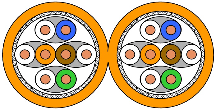 IEC 61156-5 und IEEE 802.3 af/at/bt. Der Mantel ist aus halogenfreiem, flammwidrigem Material nach und Eurobrandklasse Cca s1d1a1. Die Schirmung erfüllt mit einer Kopplungsdämpfung von 85 dB die Trennklasse D nach EN50174. Das Kabel ist zukunftssicher für alle Anwendungen nach Klasse C, D, E, EA, F und FA und geeignet zum Betrieb von PoE und PoE+ über eine Channellänge nach Klasse C, D, E, EA, F und FA bis 100m. Es ist geeignet für folgende Übertragungen: Telefonie, Ethernet, Fast Ethernet, Gigabit Ethernet und 10Gigabit Ethernet
