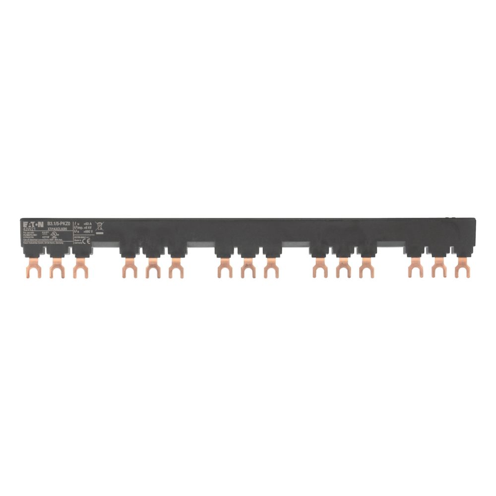 Drehstromschienenblock, 3-polig für Einspeisungseinheit von 5 PKZM0-... mit Hilfsschalter oder Auslöseanzeige auf der rechten Seite, Länge 261mm Schutz gegen direkten Kontakt., Ue = 690 V, Iu = 63 A