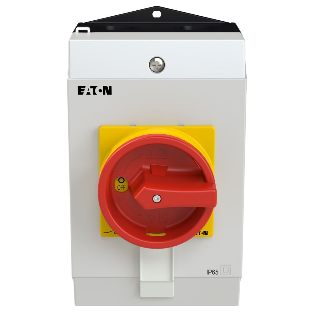 Hauptschalter, P1, Bemessungsdauerstrom (Iu): 25 A, Funktionen: NOT-AUS-Funktion, Verriegelbar, Ausstattung: Roter Drehgriff und gelber Sperrkragen, Montageart: Aufputzmontage, Polzahl: 4-polig, Verriegelungsvorrichtung: In der Position 0 (Aus) verriegelbar, Schutzart: NEMA 12Durchschnittliche Bewertung von 0 von 5 Sternen