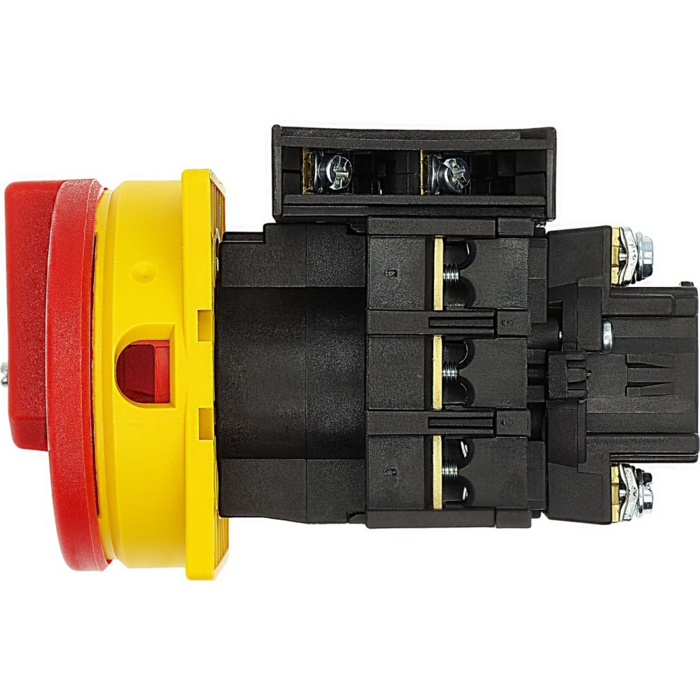 Handgriff, Grundfunktion: Bausätze, Funktion: Hauptschalterbausätze, n, mit Vorhängeschlosssperre, zum Sperren der 0-Stellung, abschließbar durch maximal 3 Bügelschlösser, verwendbar für: T0-.../E, .../Z, .../I1, T3-.../E, .../Z, .../I2, P1- /E, /Z, /I2, verwendbar für: T0 bis max. 4 Baueinheiten, T3 bis max. 6 Baueinheiten, rot/gelb, Ausführung mit rotem Drehgriff und gelbem Sperrkranz, NOT-AUS/NOT-HALT: als NOT-AUS-/NOT-HALT-Funktion, Schaltwinkel: 90 °