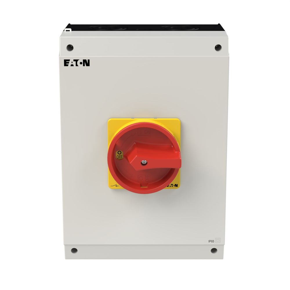 Hauptschalter, Sortiment: Hauptschalter, Wartungsschalter, Typkenner: P3, Stopp-Funktion: NOT-AUS-Funktion, mit rotem Drehgriff und gelbem Sperrkranz, Information zum Lieferumfang: vom Benutzer montierter Hilfsschalter., 3-polig + N, Verriegelungsvorrichtung: In der Position 0 (Aus) verriegelbar, Schutzart: IP65, Bauform: Oberflächenmontage, Bemessungsbetriebsleistung AC-23A, 50 - 60 Hz 400 V: P = 55 kW, Bemessungsdauerstrom: Iu = 100 A, Normen und Bestimmungen: IEC/EN 60947, VDE 0660, IEC/EN 60204, CSA, UL, Lasttrennschalter nach IEC/EN 60947-3Durchschnittliche Bewertung von 0 von 5 Sternen
