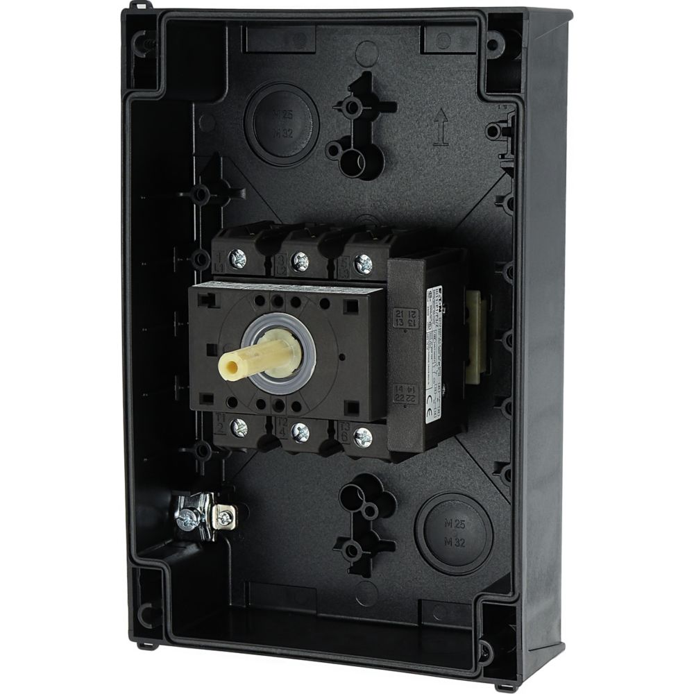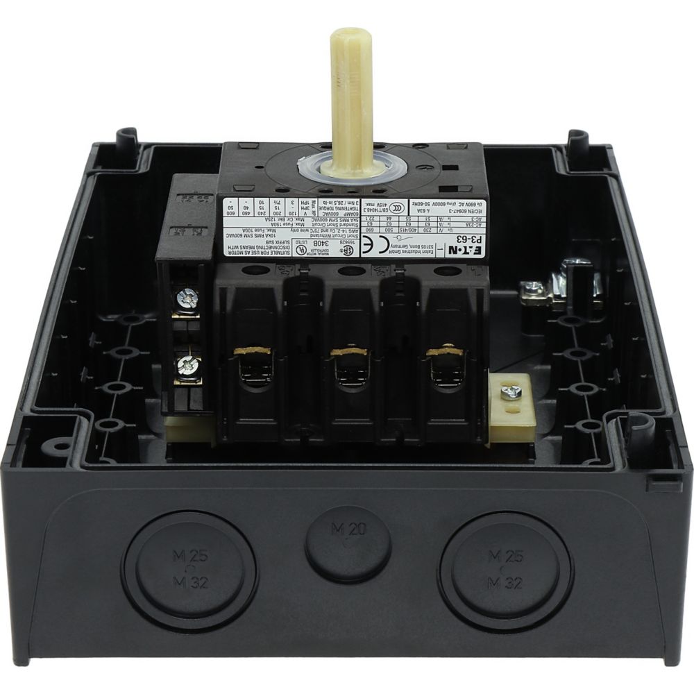 Sicherheitsschalter, Sortiment: Sicherheitsschalter, Typkenner: P3, Stopp-Funktion: NOT-AUS-Funktion, mit rotem Drehgriff und gelbem Sperrkranz, Hinweis: mit Warnschild Sicherheitsschalter , Information zum Lieferumfang: Hilfskontakt oder Neutralleiter kundenseitig montiert., 3-polig, Verriegelungsvorrichtung: abschließbar in 0-Stellung mit Deckelverriegelung, Schutzart: IP65, Bauform: Oberflächenmontage, Bemessungsbetriebsleistung AC-23A, 50 - 60 Hz 400 V: P = 30 kW, Bemessungsdauerstrom: Iu = 63 A, Normen und Bestimmungen: IEC/EN 60947, VDE 0660, IEC/EN 60204, Lasttrennschalter nach IEC/EN 60947-3Durchschnittliche Bewertung von 0 von 5 Sternen