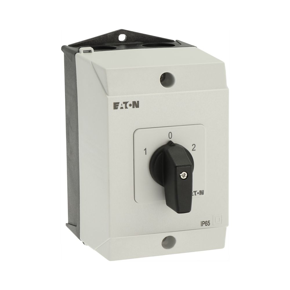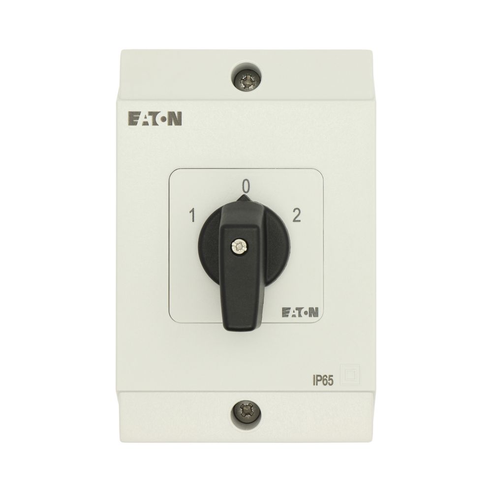 Umschalter, Sortiment: Steuerschalter, Typkenner: T0, mit schwarzem Knebel und Frontschild, Kontakte: 6, Schutzart: IP65, Bauform: Oberflächenmontage, Schaltwinkel: 60 °, Schaltverhalten: rastend, mit 0-Stellung, Frontschild: 1-0-2, Bemessungsbetriebsleistung AC-23A, 50 - 60 Hz 400 V: P = 5,5 kW, Bemessungsdauerstrom: Iu = 20 A, 3 Baueinheit(en), Normen und Bestimmungen: IEC/EN 60947, VDE 0660, IEC/EN 60204, Lasttrennschalter nach IEC/EN 60947-3Durchschnittliche Bewertung von 0 von 5 Sternen