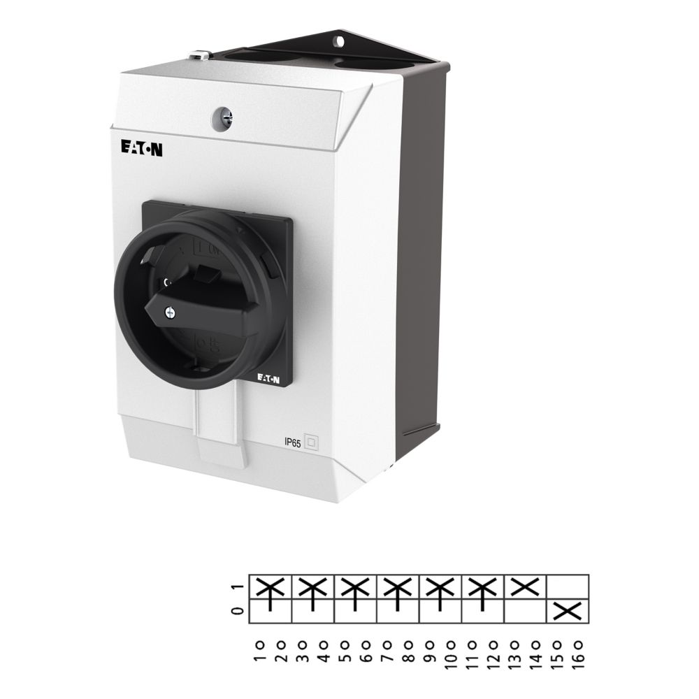 Hauptschalter, Sortiment: Hauptschalter, Wartungsschalter, Reparaturschalter, Typkenner: T3, Stopp-Funktion: STOPP-Funktion, mit schwarzem Drehgriff und Sperrkranz, 6-polig, Verriegelungsvorrichtung: In der Position 0 (Aus) verriegelbar, Schutzart: IP65, Bauform: Oberflächenmontage, Schaltwinkel: 90 °, Bemessungsbetriebsleistung AC-23A, 50 - 60 Hz 400 V: P = 15 kW, Bemessungsdauerstrom: Iu = 32 A, 4 Baueinheit(en), Normen und Bestimmungen: IEC/EN 60947, VDE 0660, IEC/EN 60204, Lasttrennschalter nach IEC/EN 60947-3Durchschnittliche Bewertung von 0 von 5 Sternen