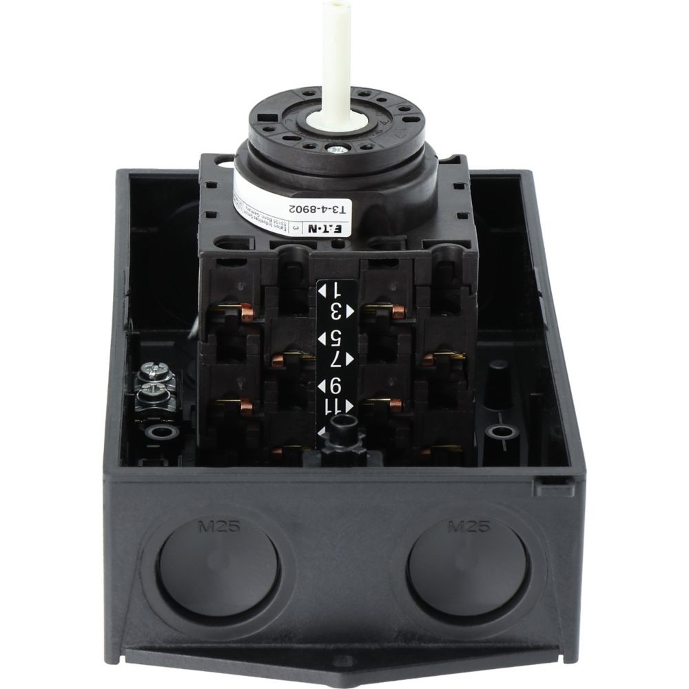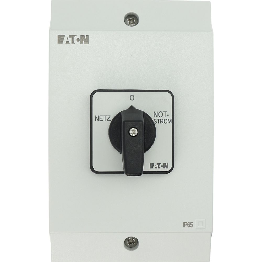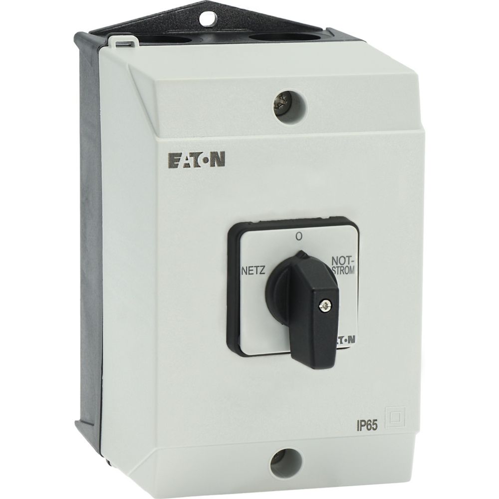 Umschalter, Sortiment: Steuerschalter, Typkenner: T3, mit schwarzem Knebel und Frontschild, Kontakte: 8, Schutzart: IP65, Bauform: Oberflächenmontage, Schaltwinkel: 60 °, Schaltverhalten: rastend, mit 0-Stellung, Frontschild: Netz-0-Notstrom, Bemessungsbetriebsleistung AC-23A, 50 - 60 Hz 400 V: P = 15 kW, Bemessungsdauerstrom: Iu = 32 A, 4 Baueinheit(en), Normen und Bestimmungen: IEC/EN 60947, VDE 0660, IEC/EN 60204, CSA, UL, Lasttrennschalter nach IEC/EN 60947-3Durchschnittliche Bewertung von 0 von 5 Sternen