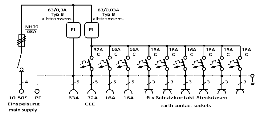 1 FI 63 A, 0,03 A, Typ B, 1 CEE 5-pol. 32 A, 2 CEE 5-pol. 16 A, 6 Schutzk.-