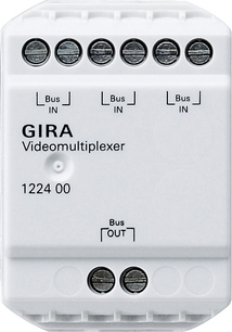 Videomultiplexer - Der Videomultiplexer bündelt die Videosignale der Türstationen, TKS-Kamera-Gateways und TKS-IP-Gateways.- Ein Videomultiplexer kann die Videosignale von drei Türstationen mit Farbkamera zusammenführen. Mit zwei Videomultiplexern können die Videosignale von bis zu fünf Türstationen zusammengeführt werden.
