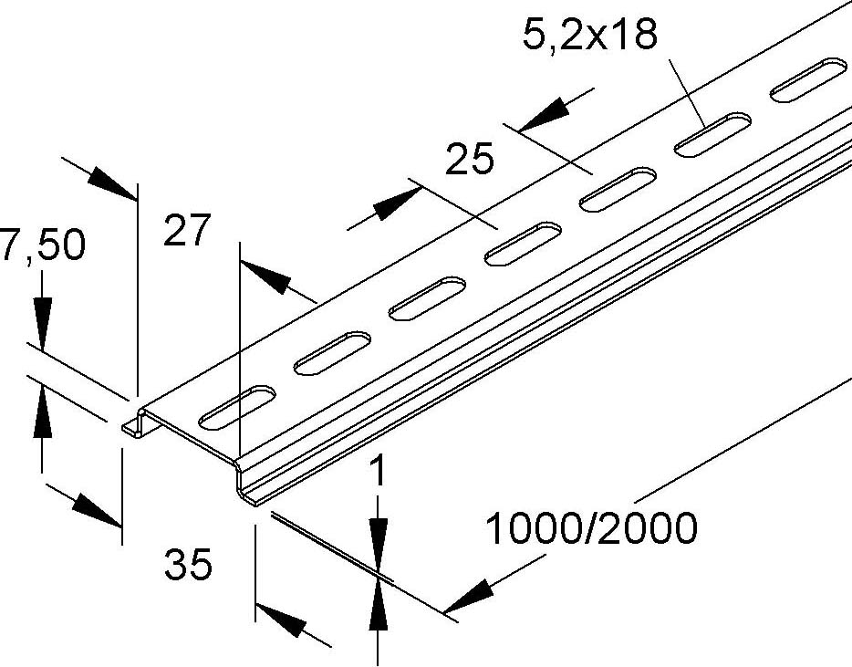 Tragschiene, Hutschiene 35 mm, Tragschiene TS 35 nach DIN EN 60715, gelocht. Verwendung für : Installationsgeräte und Reihenklemmen Abmessungen (ca. Maße) Höhe H x Breite B x Materialstärke t : 7,5 x 35 x 1 mm Breite B1 der Befestigungsebene : 27 mm Profillochung : 5,2 x 18 mm mittiger Abstand : 25 mm Lieferlänge L : 1000 mm Werkstoff : Stahl, bandverzinkt nach DIN EN 10346