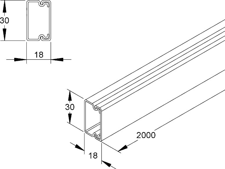 Elektroinstallationskanal, mit Deckel und einreihiger Befestigungslochung im Boden, ohne Trennwand, halogenhaltig. Halteklammern 638/3040 bitte gesondert bestellen. VDE zertifiziert! Abmessungen (ca. Maße) H x B : 18 x 30 mm einreihige Bodenlochung : 6,5 x 12 mm und Ø 2,7 mm Bodenlochabstand Rastermaß : 125 mm Lieferlänge L : 2000 mm Nutzbarer Querschnitt : 476 mm² Werkstoff : PVC-hart (Polyvinylchlorid) Farbton : reinweiß RAL : 9010 (ähnlich)