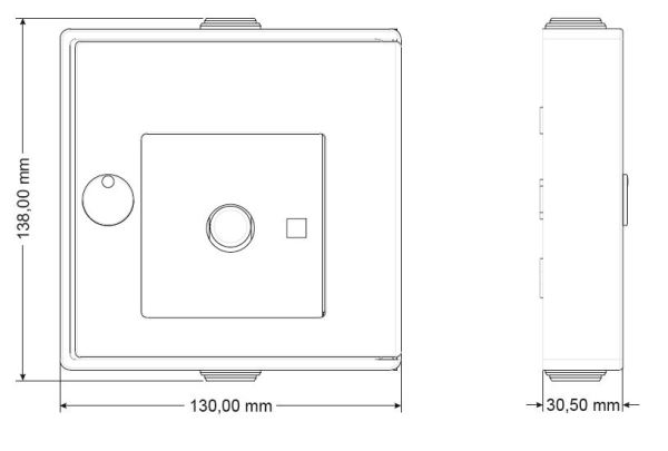 LED rot, Rücksetztaster, LED am Funkmodul rot, Piezo-Hupe. Konfigurationsschnittstellen: Dip-Schalter, Drehschalter, Bedientaster rot