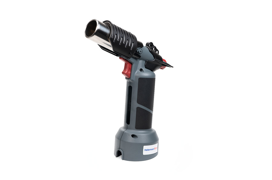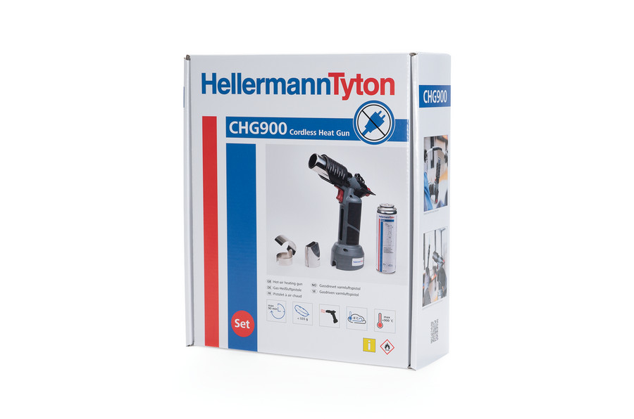 Sofortiger flammenloser Luftstrom bis zu 900 °C ohne externe Energie. Kabellos inkl. einer Gas-Patrone und zwei Aufsteckdüsen. Für präzises Arbeiten ohne Stromanschluß in jeder Position. Gewicht des Werkzeugs: 440 g (555 g inkl. Gas-Patrone). Werkzeugloser Austausch von Piezo-Zündung und Gasdüse. Neuartiges 3-Komponenten Gasgemisch, für höheren Druck auch bei Außentemperaturen bis zu -8 °C. Betriebsdauer: ca. 1,5 Stunden mit einer Gaspatrone Typ P445. Die kabellose Heißluftpistole CHG900 von HellermannTyton wird mit den P445-Gaskartuschen betrieben und ermöglicht ein autonomes Arbeiten bis 60 Minuten. Die Heißluftpistoleerzeugt einen flammenlosen Luftstrom und ist damit ideal für das Schrumpfen von wärmeschrumpfenden Produkten aller Art, sowie zum Weichlöten, Kunststoffverformen und Entfrosten geeignet. Zudem eignet sich das CHG900 für raue Außenbedingungen mit Temperaturen bis zu -8 °C.