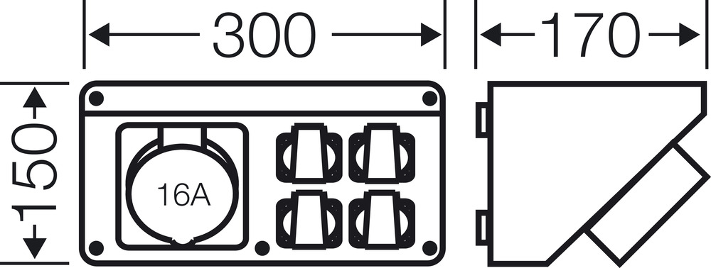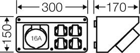 Connection Box mit 1 x CEE-Steckdose 16 A, 5-polig und 4 x Schutzkontaktsteckdose (Typ F) 16 A, 2-polig + PE. Zum Anbau an Gehäusewände 300 mm. Steckdosen können um 90° gedreht werden.