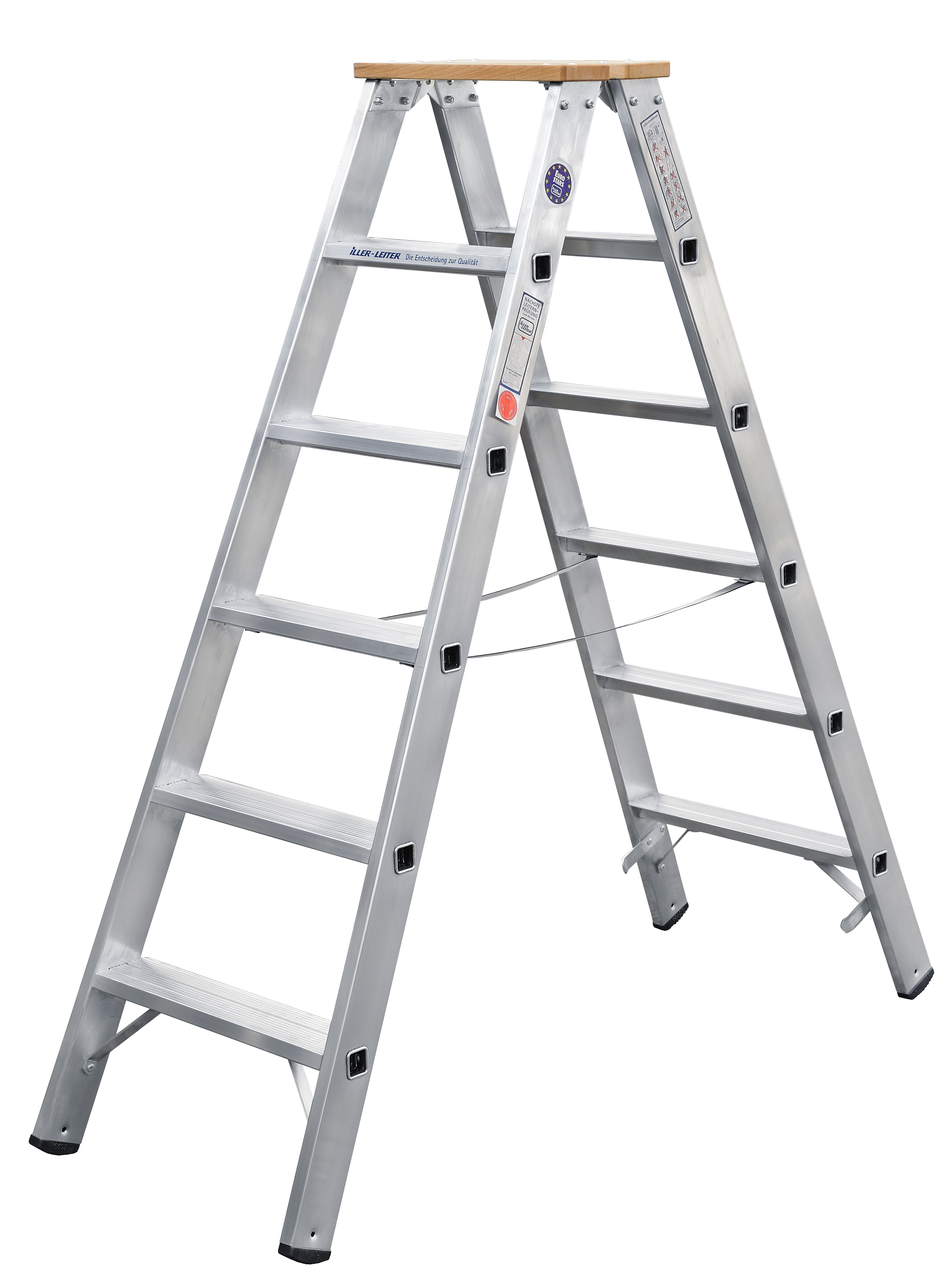 Stufenstehleiter in Handwerkerqualität mit 2 x 8 Stufen, beidseitig begehbar, 80 mm tiefe Stufen, trittsicher profiliert für bequemen und sicheren Stand, Stufen durchgesteckt und verbördelt, 2 Holzstufen als oberer Leiternabschluss, stabile Stahlscharniere, robuste und dauerhafte Profilqualität, Eckaussteifungen unter der untersten Sprosse, Holmgröße 70 mm, nach DIN EN 131, ermöglicht TRBS konformes ArbeitenDurchschnittliche Bewertung von 0 von 5 Sternen