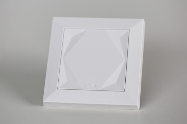Der Loxone Touch Tree verfügt über fünf Tastpunkte zur Bedienung der wichtigsten Funktionen eines Raumes. Bei Berührung einer Taste erfolgt ein Klicken als akustische Bestätigung. Zur Messung von Temperatur und relativer Luftfeuchte ist ein Sensor integriert.