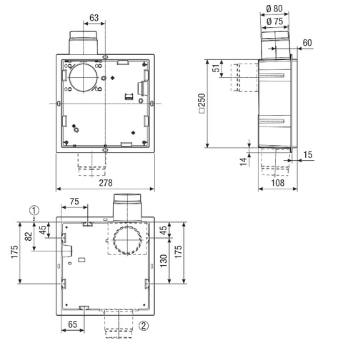 Besondere Eigenschaften - Ausblasstutzen werkzeuglos umbaubar von seitlich nach hinten. - Seitliche Montagenuten zur Montage mit Montagewinkeln oder in Vorwandinstallationen. - Selbsttätige Kunststoffrückschlagklappe mit der gleichzeitigen Funktion als Kaltrauchsperre. - Für Anwendungen nach DIN 18017-3.Einraumentlüftung - Einbau in Bäder, WCs und Wohnungsküchen. - Einbau innerhalb und außerhalb des Schachtes in Wand und Decke möglich. - Geringe Bautiefe des Unterputzgehäuses und der Abdeckung. - 6 seitlich angebrachte Montagenuten ermöglichen eine einfache Montage. - Umlaufender Rahmen ermöglicht weitere Befestigungsoption. - Flexible Kabeleinführung ermöglicht den elektrischen Anschluss seitlich oder von hinten. - Einfache elektrische Verdrahtung an praktischer Stiftleisten-Klemme. - Mit Putzschutzdeckel zum Verschließen des Gehäuses während der Rohbauphase. - Werkzeuglos umbaubarer Kunststoff-Ausblasstutzen mit selbsttätiger Kunststoff-Rückschlagklappe für Ausblasrichtung seitlich (oben, links, rechts) und hinten. - Anschlussdurchmesser DN 75/80. - Sollbruchstelle für Zweitraumanschluss oder WC-Anschlussstutzen serienmäßig im ER GH-Gehäuse vorhanden. - Allgemeine bauaufsichtliche Zulassung, Zulassungs-Nr.: Z-51.1-38. - Zulassungsbescheide auf Anfrage oder auf unserer Homepage www.maico-ventilatoren.com. - Kunststoffteile normal entflammbar nach DIN 4102-1 Klasse B 2 (nach EN 13501-1).Optionales Zubehör - Absaugstutzen ER-AS für die WC-Sitzentlüftung - Zweitraumanschluss ER-ZR - Montageset ER-MS - Montagehalter ER-UPMArtikel:ER GH - Ausführung: Kunststoff-Ausblasstutzen umbaubar seitlich/hinten mit selbsttätiger Kunststoff-Rückschlagklappe, ohne Brandschutzgehäuse, Zweitraumanschluss rechts/links/unten möglich - Luftrichtung: Entlüftung - Einbauort: Wand / Decke - Einbauart: Unterputz - Material Gehäuse: Kunststoff - Farbe: schwarz - Gewicht: 0,59 kg - Gewicht mit Verpackung: 0,89 kg - Brandschutz: nein - Ausblasrichtung: seitlich / hinten - Anschlussdurchmesser: 75 mm / 80 mm - Breite: 250 mm - Höhe: 250 mm - Tiefe: 110 mm - Breite mit Verpackung: 350 mm - Höhe mit Verpackung: 290 mm - Tiefe mit Verpackung: 130 mm - Zulassungsnummer: Z-51.1-478- Produktdatenblatt_0084_0350.pdf