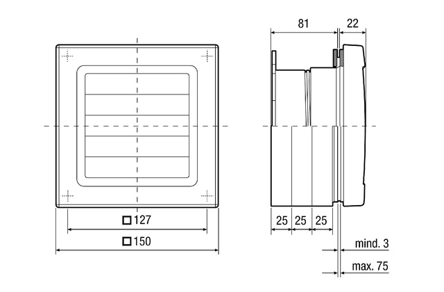 Merkmale - Für den Einbau von Kleinraumventilatoren der Gruppe ECA 100 ipro in Fenster und dünne Wände. - Farbe verkehrsweiß ähnlich RAL 9016. - Gehäuse aus schlagfestem Kunststoff. - Lieferumfang: Außenklappe AP bzw. Außengitter SG, 3 x Distanzrahmen, 2 x Dichtungsringe, Gewindestutzen, 2 x Schrauben zur Ventilatorbefestigung, Zugentlastungsbügel mit 2 x Schrauben, Leitungstülle, Montageanleitung.Montagehinweise - Einfache Montage im Fensterausschnitt durch ineinander verschraubbaren Adapter und Gewindstutzen. - Scheibendicke mindestens 3 mm, Scheibenabstand bis 75 mm. - Scheibenausschnitt 115 bis 120 mm. - Nicht für den Einbau in aufklappbare Doppelfenster geeignet.Elektrischer Anschluss - An der Klemmleiste im Gehäuse des ECA 100 ipro...Artikel:FE 100/1 AP - Einbauort: Fenster / dünne Wand - Einbaulage: waagerecht - Material: Kunststoff, schlagfest - Farbe: verkehrsweiß, ähnlich RAL 9016 - Gewicht: 0,4 kg - Gewicht mit Verpackung: 0,48 kg - Breite: 150 mm - Höhe: 150 mm - Tiefe: 103 mm - Breite mit Verpackung: 157 mm - Höhe mit Verpackung: 157 mm - Tiefe mit Verpackung: 123 mm