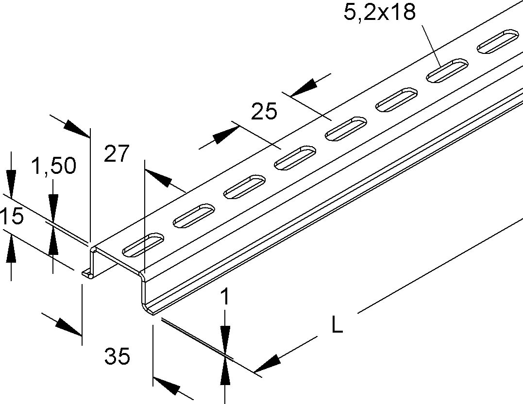 Tragschiene Modell 2934, Hutschiene 35 mm, Tragschiene TS 35 ähnlich DIN EN 60715 jedoch deren Anschlussmaße der vorgenannten Norm entsprechen, gelocht. Verwendung für : Installationsgeräte und Reihenklemmen Abmessungen (ca. Maße) Höhe H x Breite B x Materialstärke t : 15 x 35 x 1,5 mm Breite B1 der Befestigungsebene : 27 mm Profillochung : 5,2 x 18 mm mittiger Abstand : 25 mm Lieferlänge L : 2000 mm Werkstoff : Stahl, galvanisch verzinkt nach DIN EN ISO 19598, dickschichtpassiviert