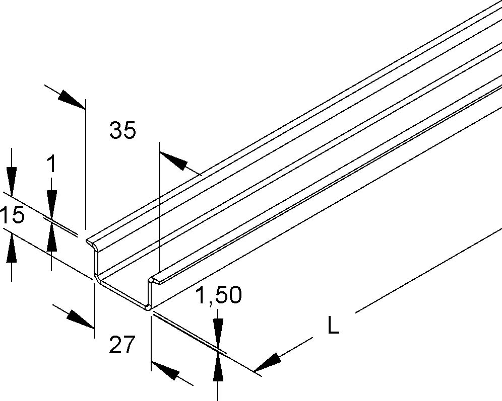 Tragschiene Modell 2934, Hutschiene 35 mm, Tragschiene TS 35 ähnlich DIN EN 60715 jedoch deren Anschlussmaße der vorgenannten Norm entsprechen, ungelocht. Verwendung für : Installationsgeräte und Reihenklemmen Abmessungen (ca. Maße) Höhe H x Breite B x Materialstärke t : 15 x 35 x 1,5 mm Breite B1 der Befestigungsebene : 27 mm Lieferlänge L : 2000 mm Werkstoff : Stahl, galvanisch verzinkt nach DIN EN ISO 19598, dickschichtpassiviert