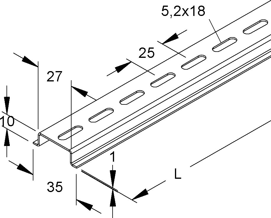 Tragschiene Modell 2935, Hutschiene 35 mm, Tragschiene TS 35 ähnlich DIN EN 60715 jedoch deren Anschlussmaße der vorgenannten Norm entsprechen, gelocht. Verwendung für : Installationsgeräte und Reihenklemmen Abmessungen (ca. Maße) Höhe H x Breite B x Materialstärke t : 10 x 35 x 1 mm Breite B1 der Befestigungsebene : 27 mm Profillochung : 5,2 x 18 mm mittiger Abstand : 25 mm Lieferlänge L : 2000 mm Werkstoff : Stahl, galvanisch verzinkt nach DIN EN ISO 19598, dickschichtpassiviert