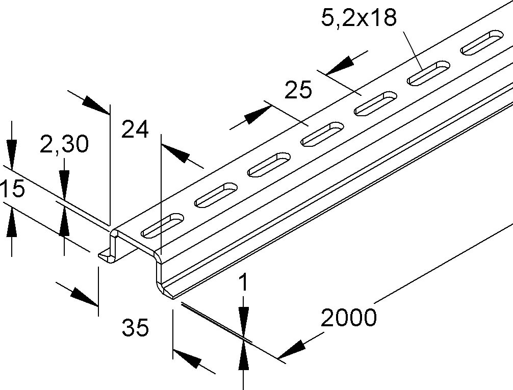 Tragschiene Modell 2936, Hutschiene 35 mm, Tragschiene TS 35 ähnlich DIN EN 60715 jedoch deren Anschlussmaße der vorgenannten Norm entsprechen, gelocht. Verwendung für : Installationsgeräte und Reihenklemmen Abmessungen (ca. Maße) Höhe H x Breite B x Materialstärke t : 15 x 35 x 2,3 mm Breite B1 der Befestigungsebene : 24 mm Profillochung : 5,2 x 18 mm mittiger Abstand : 25 mm Lieferlänge L : 2000 mm Werkstoff : Stahl, galvanisch verzinkt nach DIN EN ISO 19598, dickschichtpassiviert