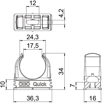 Aufputzschelle zur Aufnahme von metrischen Stahlpanzerrohren, leichten und schweren Isolierrohren sowie Elektroinstallationsrohr Quick-Pipe. Universelle Befestigungsmöglichkeiten an Wand und Decke im Innen- und geschützten Außenbereich. Mit Langloch zum seitlichen Ausrichten bei Montage mit Holzschraube oder Schlagdübel. Werkzeuglose Rohrmontage. Aneinander reihbar auch mit OBO Multi-Quick- oder proQuick-Schelle. Größe M16 - M32 kann auf Gewinde M6 geschraubt werden. Befestigungsabstand 50 - 60 cm, max. Auszugswerte F bei 20° C Raumtemperatur siehe Tabelle.
