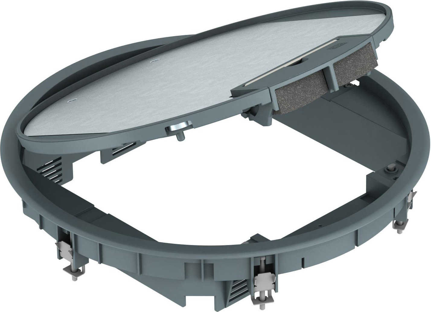 Geräteeinsatz mit Rastschieber für bis zu 12 Modul 45-Einzelgeräte in 3 Universalträger UT4, Einsatz in Kanalsystemen und Systemböden im Innenbereich.Bodenbelagaussparung im Klappdeckel 5 mm, bei Bedarf auch einstellbar auf 3, 10 oder 12 mm.