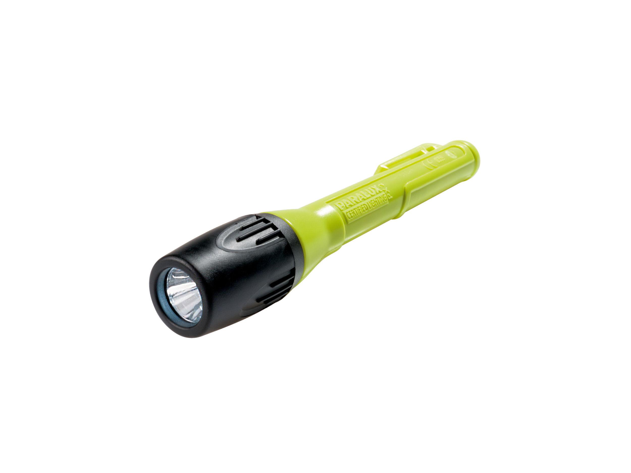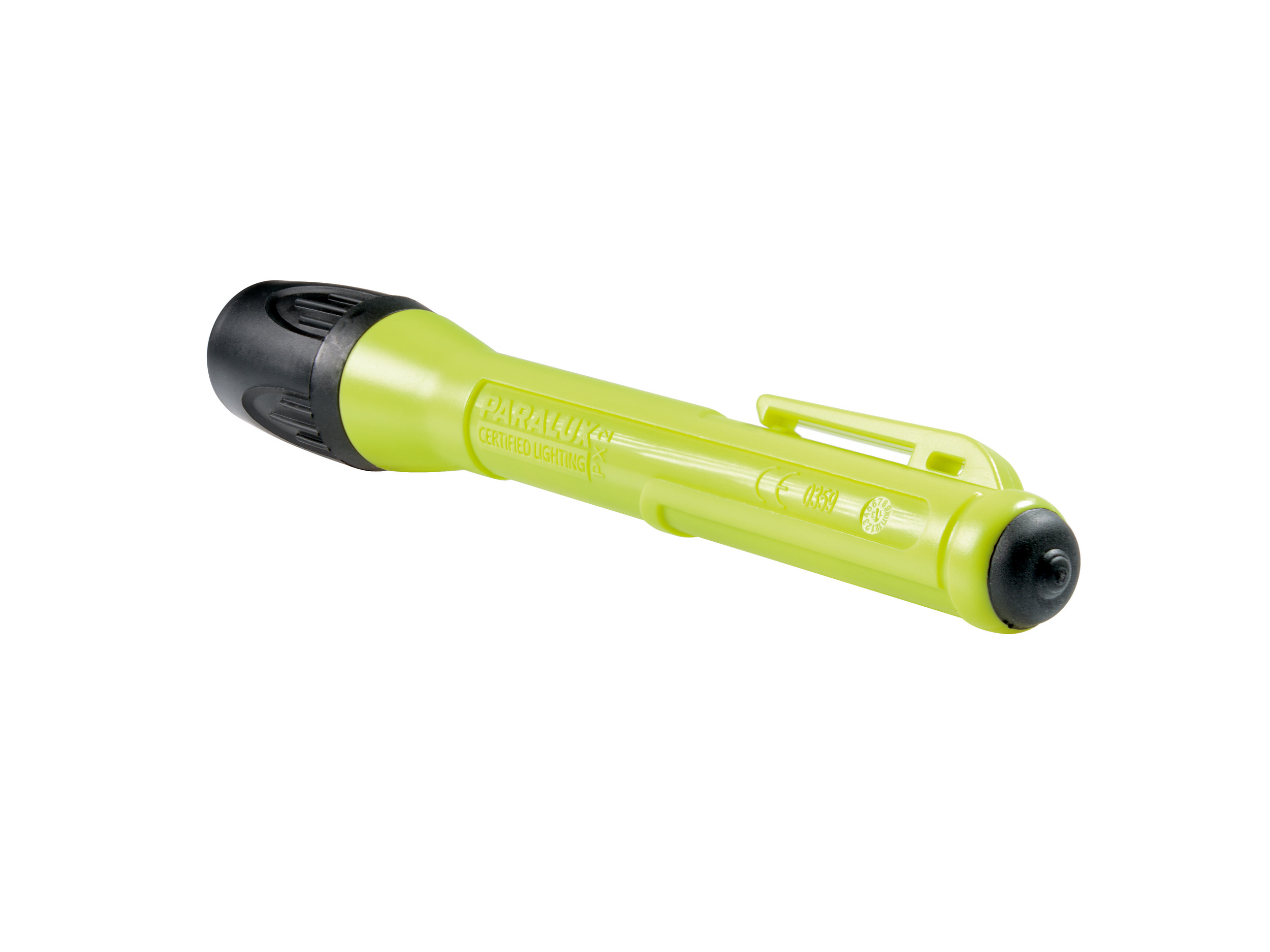 Das schlanke Gehäuse der Sicherheitsleuchte wird aus nicht leitfähigem Polycarbonat gefertigt. Das verwendete Material ist sehr robust und zu 100 Prozent wasser- und staubdicht. Für eine komfortable Einhandbedienung befindet sich im Heck der Leuchte ein gummierter Knopf. Der Heckknopf ermöglicht das einfache Ein- und Ausschalten der Leuchte. Im Vorderteil der Sicherheitsleuchte ist ein gummierter Leuchtenkopf eingebaut. Der Leuchtenkopf ist mit Aluminium beschichtet und mit einem langlebigen LED-Leuchtmittel ausgestattet. Die Leuchtweite der Sicherheitsleuchte beträgt etwa 35 Meter. Die Sicherheitsleuchte ist für das PARASNAP® -System vorbereitet und kann damit an Arbeitshelmen befestigt werden. Zur einfachen Befestigung an einem Gürtel oder eine Tasche, befindet sich ein Clip am Gehäuse der Sicherheitsleuchte. Die Lieferung der Sicherheitsleuchte erfolgt inklusive Batterien. Durch den zertifizierten Explosionsschutz ist die Sicherheitsleuchte für extreme Arbeits- und Einsatzbereiche geeignet.