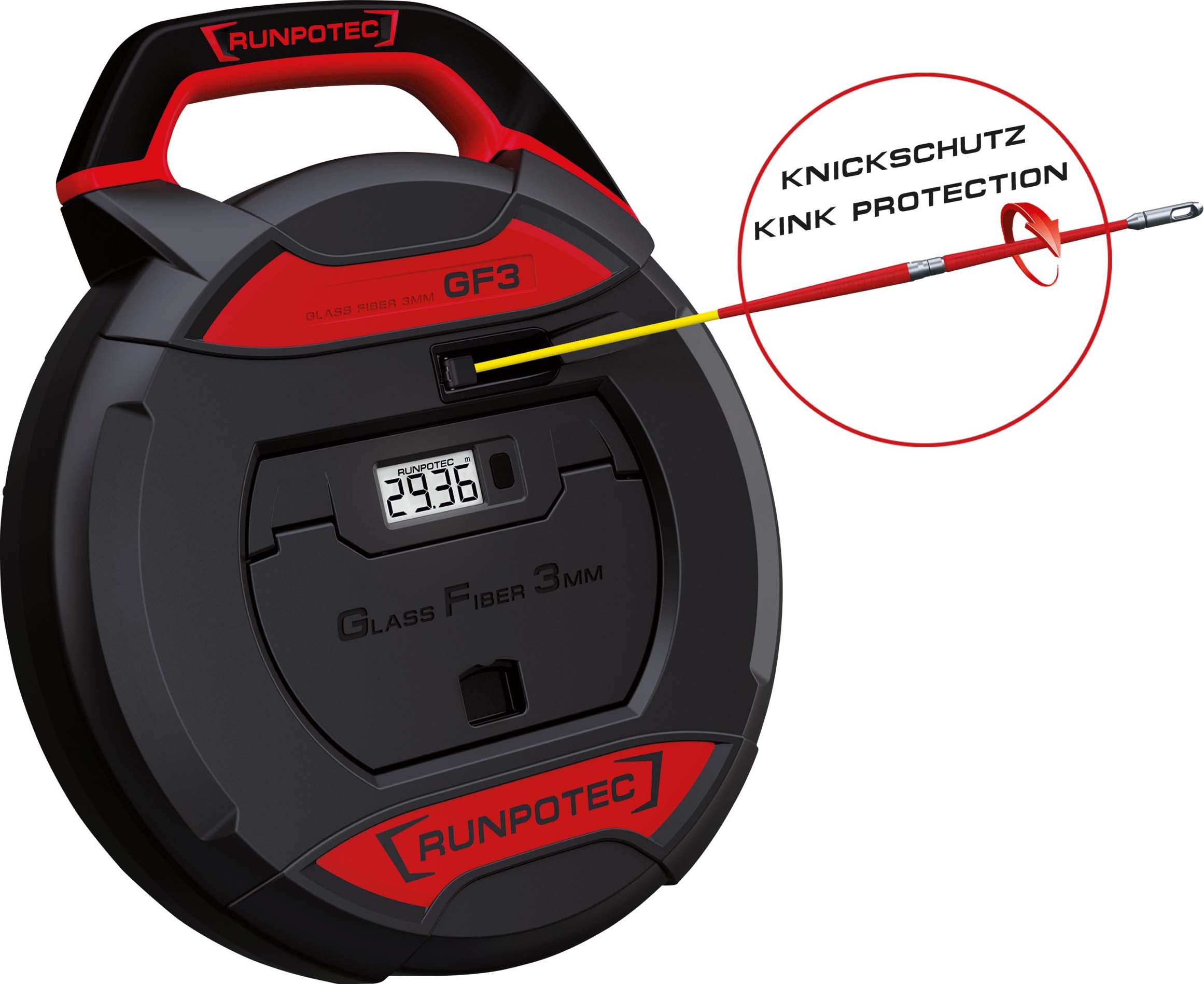 GF3 - Kabeleinziehgerät inkl. digitalem Meterzähler, Glasfaserstab Ø 3 mm mit Knickschutz-Endhülse (Innengewinde RTG Ø 6 mm) und patentierter RG7 Führungsspitze mit Drallausgleich (2 x Außengewinde RTG Ø 6 mm). Verstaut in einer stoßfesten Kunststoffbox. Die Box ist spritzwasser- und staubgeschützt, extrem stoßfest und somit bestens für die Baustelle geeignet. Die GF3 - Kunststoffbox lässt sich mit nur einer Schraube für Servicearbeiten öffnen. Die Rückschub-Sicherung verhindert das unabsichtliche Rückrutschen des Glasfaserstabes in die Box. Des Weiteren verfügt die Box über einen ergonomischen Tragegriff sowie einer Anti-Rutsch Beschichtung. Im Lieferumfang ist ein 16-teiliges Zubehörset inkludiert. Die neu entwickelte Knickschutztechnik ermöglicht das Überwinden von Biegeradien bis zu R = 38 mm. Die angegebene Gesamtbruchlast von 130 kg bezieht sich auf den Glasfaserstab inkl. Knickschutzhülsen. Hervorragend geeignet in Kombination mit der RC2 oder RC3 Inspektionskamera. Die inkludierte Kabelziehschlaufe (Ø 14 mm Außen) mit eingebautem Drallausgleich und Schutzkappe kann für ein oder mehrere Kabel bis zu einem Kabeldurchmesser von Ø 12 mm verwendet werden. Schnelles Anhängen der Kabel an die Schlaufe. Eventuelle Stecker werden durch Zugbelastung am Kabel geschont.Optimales Einsatzgebiet: für Rohrinnendurchmesser 9 - 45 mmANWENDUNGSFILM: Einen kurzen, sehr informativen Anwendungsfilm können Sie durch Scannen des QR-Codes oder auf www.runpotec.com ansehen.Lieferumfang: 1 x GF3 inkl. Meterzähler in Kunststoffbox, Länge 50 m, Knickschutz-Endhülse beidseitig (Anfang/Ende), Inhalt Zubehörbox: 1 x RG7 Führungsspitze mit Drallausgleich, 1 x Knickschutz-Endhülse RTG Ø 6 mm, 1 x Einziehhilfe, 1 x Spezialkleber 3 g, 1 x Kabelziehschlaufe (Ø 14 mm Außen), 6 x Klebehülse Ø 3 mm, 3 x Zugöse Ø 7 mm, 1 x Anfangsbirne Ø 11 mm, 1 x Verbindungshülse, 2 x Montageschlüssel, 1 x Knopfbatterie CR2032