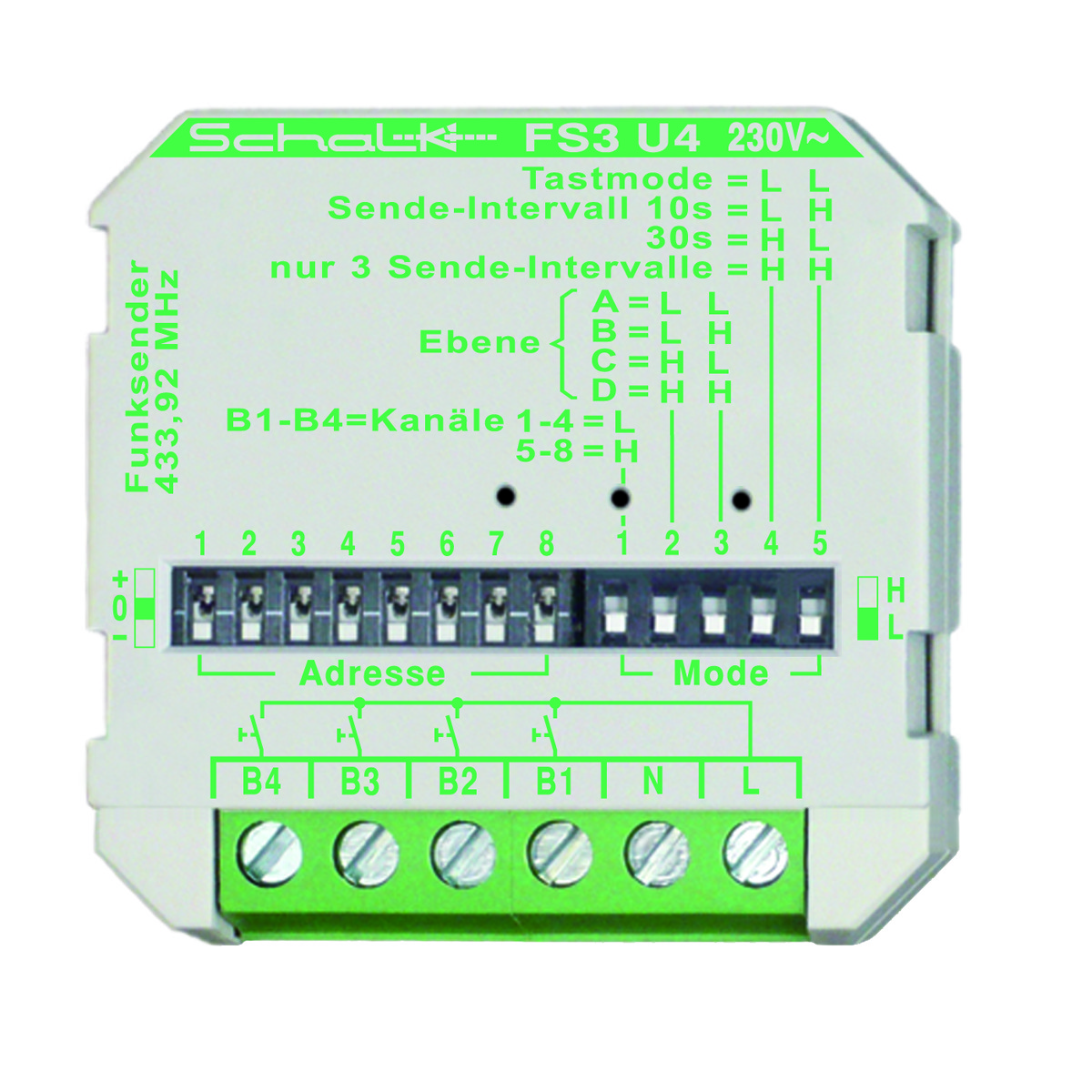 Einbausender zur Ansteuerung durch bis zu 4 externe Taster. Der Sender passt in eine Schalterdose hinter einen vorhandenen Taster/Schalter, und dients somit der Erweiterung eines bestehenden Schalterprogramm mit Funk-Funktionalität. Durch die Möglichkeit in zeitlich einstellbaren Intervallen zu senden, ist dieses Gerät optimal geeignet, langanhaltende Schaltzustände (wie z.B. Bewegungsmelder, Schaltuhr, Thermostate etc.) verlässig zu übertragen. Für diese Betriebsart kann an den jeweiligen Funkempfängern eine dem Sendeintervall entsprechende Nachlaufzeit eingestellt werden. 3 Betriebsarten (Tastmode, Intervall-Senden mit 10s oder 30s, nur 3 Sendeintervalle)., Kompatible Produkte: Funkempfänger FE3-Serie, Funkdimmer FD3-Serie, Repeater FV2 R., Maße: 43x43x33mm, 230V AC, 4 Kanäle