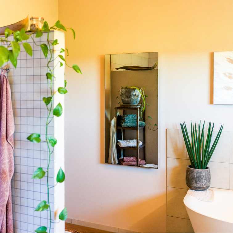 Als Infrarotheizung wird das Wand-Spiegelheizelement ortsfest zur Beheizung geschlossener Räume im Wohn- und Arbeitsumfeld eingesetzt. Das Wand-Spiegelheizelement der Baureihe VM ist für die Aufputz-Montage an der Wand geeignet. Dabei kann das Heizelement sowohl im Quer- als auch im Hochformat montiert werden.Das effektive und trotzdem dekorativ wirkende Vitramo Wandheizelement erwärmt strahlungsorientiert Wände, die den Raum umschließen und den Fußboden so differenziert, dass diese untereinander nur geringe Temperaturunterschiede aufweisen. Erst im Kontakt mit den warmen Oberflächen erwärmt sich gleichmäßig und beinahe strömungsfrei die Raumluft. Dadurch werden die Voraussetzungen der Wohnbehaglichkeit ohne unnötigen Energieeinsatz erreicht.