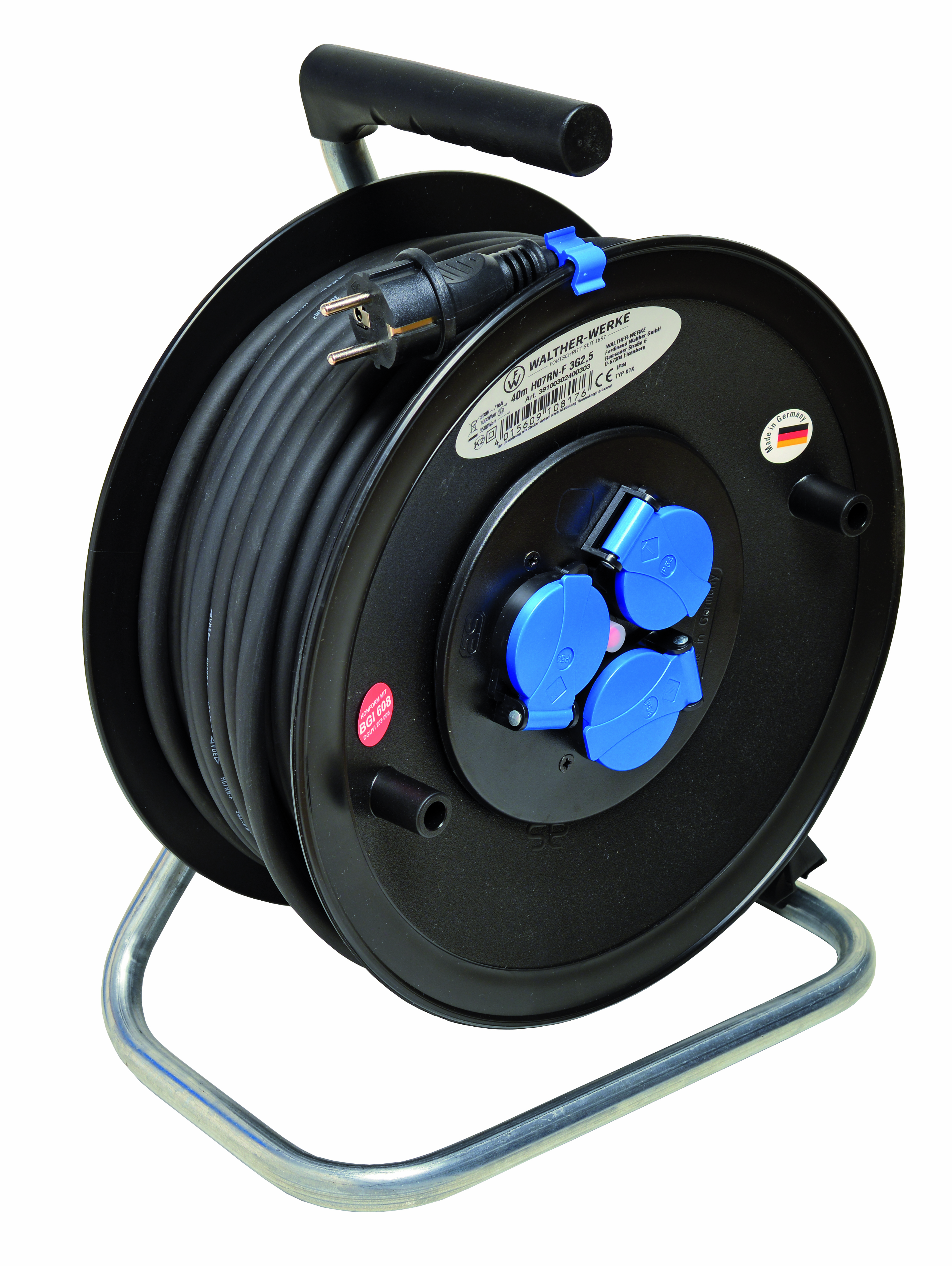 WALTHER Sicherheits-Kabeltrommel 230V mit Trommelkörper aus hochbruchfestem Spezialkunststoff stabiles, verzinktes Fußgestell mit geformten Haltegriff, Feststellbremse und LeitungsführungGesamtschutzart: IP44Bemessungsstrom: 16ALeistung bei aufgewickelter Leitung: 1500WLeistung bei abgewickelter Leitung: 3500WAbmessungen: 320 x 210 x 420mm (HxBxT) 320mm DurchmesserAnschluss:40m Gummischlauchleitung H07RN-F3G2,5 mit Schutzkontaktstecker entspricht BGI608 (DGUV-I 203-006)/K2 (BGI600) "- Gewerbe, Baustelle -"Abgänge:1 Thermoschutzschalter3 Schutzkontaktsteckdosen 16A 3P 230V mit Klappdeckel